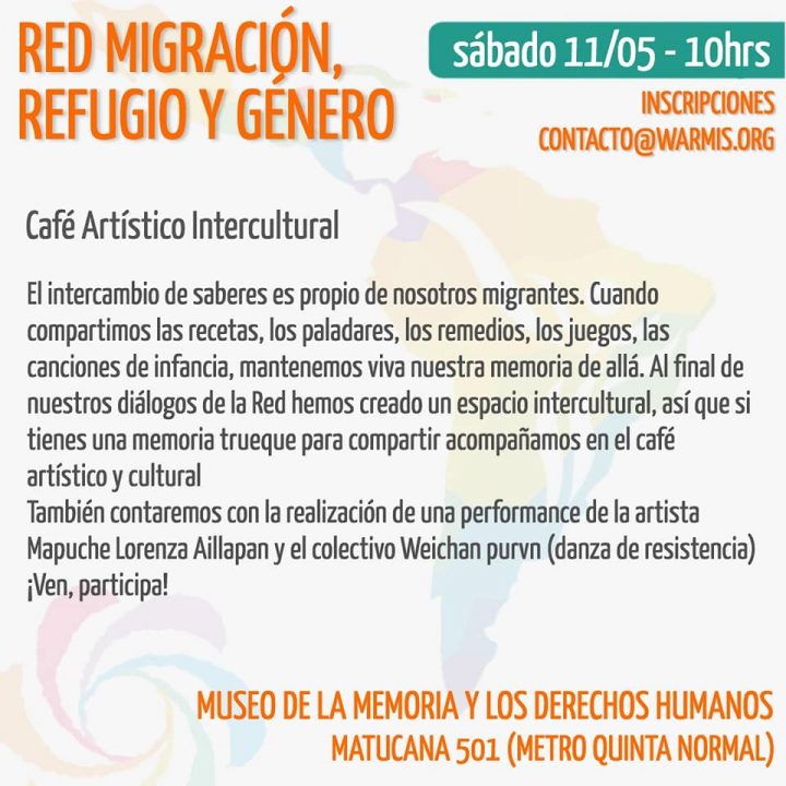 “Esta rede pretende ser um espaço de intercâmbio, reflexão e construção de propostas frente ao retrocesso nas políticas de migração e refúgio dos atuais governos, além do aumento da xenofobia e a discriminação que tais ações provocam nas sociedades da região. Consideramos pertinente dar visibilidade a estes temas e construir esse debate desde a interculturalidade e a convergência das culturas. As discussões se concentrarão em volta dos seguintes eixos: Feminismos migrantes, Saúde e práticas culturais, Migração e cidadania plena e Construção de redes de imigrantes na América latina.” – Andrea Carabantes Soto, integrante da Equipe de Base Warmis – Convergência das Culturas.