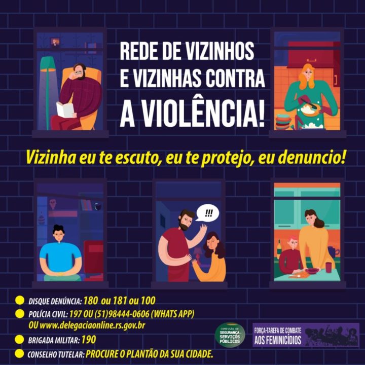 Diante da possibilidade de crescimento dos índices de violência doméstica contra mulheres, crianças e adolescentes durante o período de isolamento social, em virtude da pandemia do Covid-19, a Força-tarefa de Combate aos Feminicídios decidiu lançar uma campanha com o objetivo de mobilizar a sociedade contra as situações de violência. As situações de violência poderão ser comunicadas por meio da “Rede de Vizinhos e Vizinhas Contra a Violência: vizinha eu te escuto, eu te protejo, eu denuncio!” A iniciativa é inspirada em recomendações dos organismos internacionais de direitos humanos, que vem incentivando campanhas de denúncias com apelo à vigilância solidária dos vizinhos em vários locais do mundo.