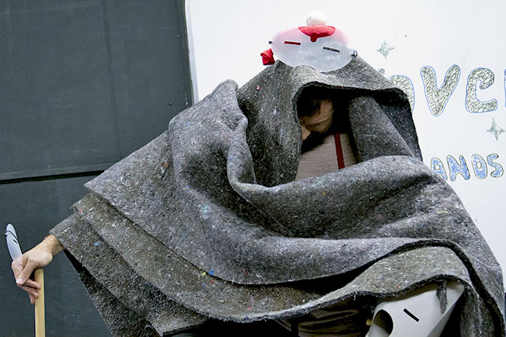 “É daí que nasce a cena. É do jogo da materialidade com a cena. É da fricção que vem a ficção!”, disse Veríssimo. Com essa afirmação, feita no calor e animação de um ensaio do Teatro da Laje na Arena Dicró – presenciado por nós na fase inicial de aproximação do projeto com a Secretaria e com o professor de teatro –, nos foi dada a chave para o problema. Confeccionamos então um conjunto de objetos simples que criavam algum nível de interferência no corpo e eram totalmente capazes de ser reproduzidos dentro da realidade escolar. Os materiais escolhidos levaram em consideração a simplicidade, o baixo custo, a agilidade de confecção e a possibilidade de replicação. A intenção foi criar brandas próteses para restrições de movimento ou alterações da forma corporal, que provocassem comportamentos de abertura individuais e coletivas.