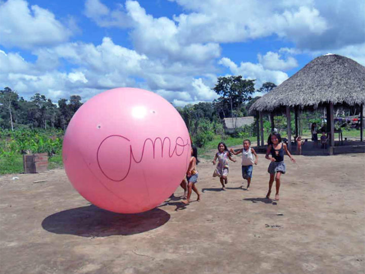 Uma bola cor-de-rosa de dois metros de diâmetro com a inscrição da palavra AMOR é atirada ao público. A imagem da bola passando sobre as cabeças, os toques repentinos, a rolagem contínua sobre a terra, o flutuar nas águas da praia, os corpos atiçados, o corde- rosa brilhando na multidão e a inscrição do amor em sua pele relembram a pulsão de um objeto simbólico-circular, simultaneamente de todos e de ninguém. Por um gesto de respiro e queda, o amor converge com peso e ar, sobre e entre todos. A obra/performance da artista carioca Maria Nepomuceno retratada no vídeo Expiro de 2006, simboliza o gesto comum sobre esse objeto, simultaneamente coletivo e singular, a partir de quatro ações públicas com a bola AMOR: a primeira na praia do Leme em 2003, depois no bloco de carnaval Cordão do Bola Preta em 2006, em 2012, na tribo dos índios Huni Kuin no Acre e em Margate na Inglaterra. Em cada uma delas, o gesto performativo no qual o privado referente à simbologia da palavra amor conecta-se diretamente ao arremesso expropriado, “um amor que ninguém consegue segurar” conforme diz a artista. A ação pode durar o tempo de um coletivo desendereçado e lembra mais uma vez sobre toque, receptividade, ar e amor (ao próximo e ao distante). Outro corte!