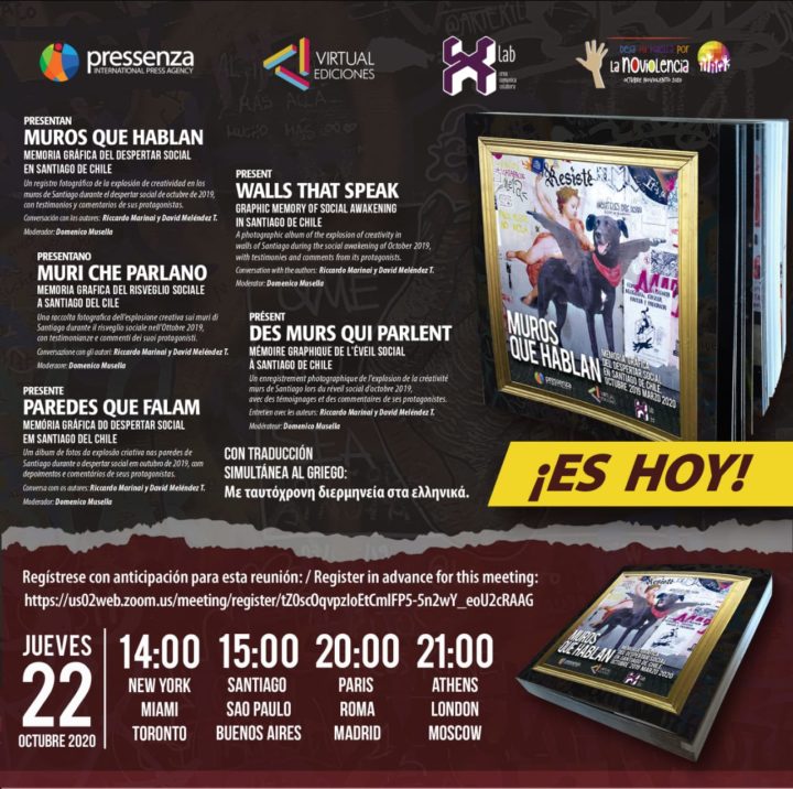 Esta quinta 22 de outubro Pressenza lançou no Chile o livro “Muros que hablan (Muros que falam). Memoria gráfica do despertar social em Santiago de Chile. Outubro de 2019-março de 2020″, através da plataforma zoom. Assistiram colaboradores e leitores da Pressenza desde diferentes pontos do planeta, para escutar a seus autores – Riccardo Marinai e David Meléndez Tormen – e a colaboradoras de redações de outros países, como Magaly Navarrete (Berlim), Nelsy Lizaraso (Quito) e Raquel Paricio (Barcelona). Conduziu Domenico Musella.