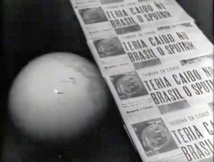 Corta para a cena do “O Homem do Sputnik”, onde o “Camarada Karamazov”, do governo russo, recebe a informação de que o Sputnik teria caído no “Brazil”, diante de um casal de camponeses famintos.