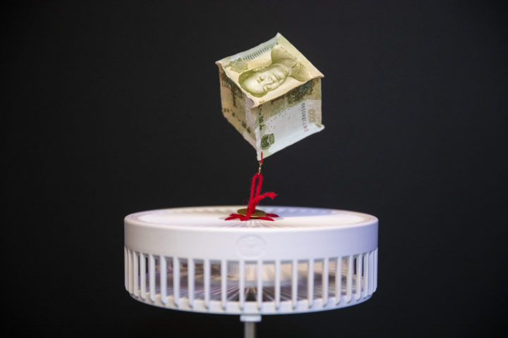 As notas chinesas, autênticas, “zero quilômetro” e com certificado de garantia, foram adquiridas em lojas de numismática. Com elas Cassaro fez seus famosos e delicados “cubinhos”, que evoluem no ar movidos pelo vento. “Prosperidade soprada pelo vento”, conta. Treze desses cubinhos foram feitos de cédulas da Segunda Revolução Chinesa, que trazem estampadas o rosto de Mao-Tsé-Tung (1893-1976). Um outro cubo, maior, foi construído com notas da Primeira Revolução, de 1911.
