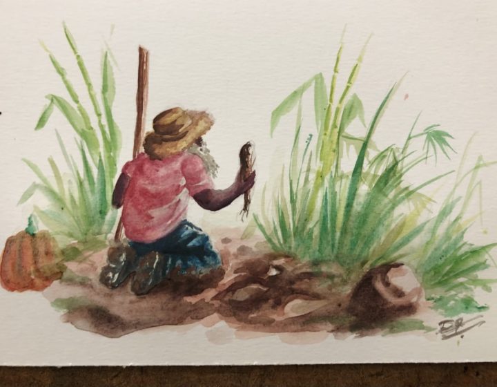 O homem gentil está sentado à beira da estrada de chão, que mais parece uma trilha com suas ondulações. Ele, sua barba rala, seu chapéu de feltro, seu sorriso sincero e sua pele de jambo, são gratos pelos frutos da terra que ara, planta, colhe e se alimenta.