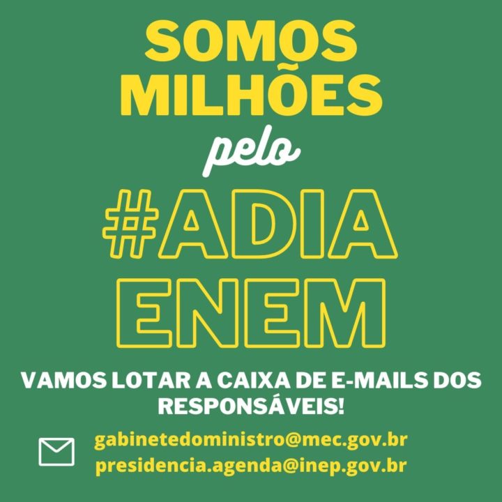 #adiaenem pede a participação de todas, todos e todes que são pela vida. A campanha tem o objetivo de “lotar a caixa de e-mails dos responsáveis”. No caso, as caixas do ministro da Educação, do presidente do Instituto Nacional de Estudos e Pesquisas Educacionais (INEP) e das ouvidorias dos Ministérios Públicos dos estados, manifestando-se pelo adiamento do exame nacional, como explica o movimento: