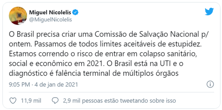 E ainda foi além: “O Brasil precisa criar uma Comissão de Salvação Nacional p/ ontem. Passamos de todos limites aceitáveis de estupidez. Estamos correndo o risco de entrar em colapso sanitário, social e econômico em 2021. O Brasil está na UTI e o diagnóstico é falência terminal de múltiplos órgãos”.