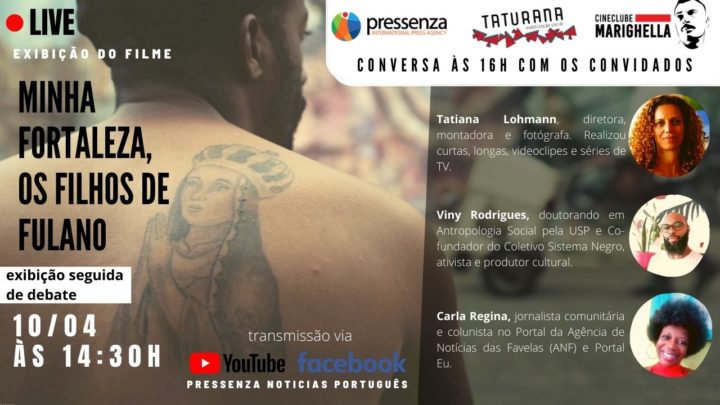 Logo após a exibição do filme, seguiremos na sequência com a transmissão do bate-papo, às 16h, com a participação de Carla Regina moradora do Morro do Turano, no bairro da Tijuca, jornalista comunitária e colunista no Portal da Agência de Notícias das Favelas (ANF) e Portal Eu. Viny Rodrigues, doutorando em Antropologia Social pela USP, onde pesquisa temas relacionados à masculinidades negras e culturas periféricas. Co-fundador do Coletivo Sistema Negro, ativista e produtor cultural. Tatiana Lohmann, diretora, montadora e fotógrafa. Realizou curtas, longas, videoclipes e séries de TV (Globoplay, Canal Curta!, MTV, TV Cultura, Nat Geo, TV Brasil). Também contaremos com a presença dos integrantes do Cineclube Marighella, Gustavo Machado, Fabio e Leonardo Puglia e da jornalista Lillian Bento, editora da Redação Pressenza Brasil.