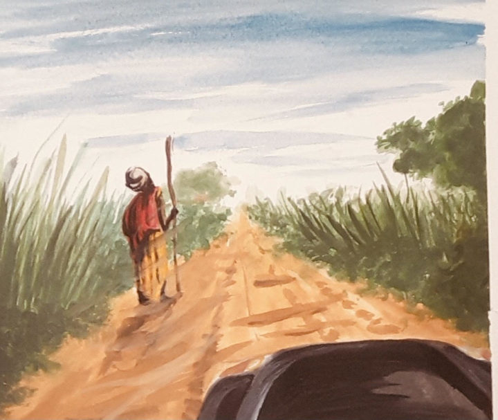 O carro avança em direção oposta ao asfalto da estrada que corta a região. De longe avisto um negro vestido em seus andrajos. Tão negro que nele o sol reluz. Na mão direita, um cajado de madeira nativa. Na cabeça, um torso. São tantos os buracos que acabo desviando o olhar daquele sujeito fantástico, coberto por panos coloridos.