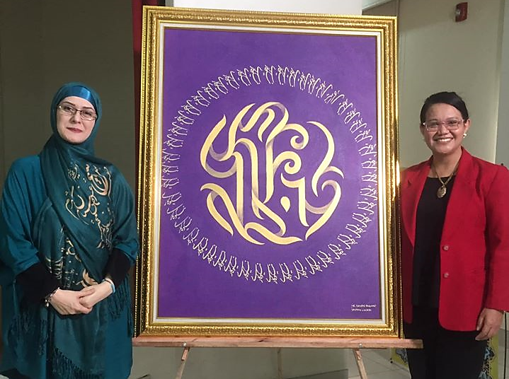 Dra. Tandis Taghavi ao lado de uma de suas muitas obras de arte da caligrafia islâmica exibidas durante a celebração do Dia Internacional da Mulher da ONU (2019), organizada pela Igreja de Jesus Cristo dos Santos dos Últimos Dias. A obra foi presenteada aos organizadores do evento. Na foto, com a Dra. Genevieve Balance Kupang, ambas especialistas no assunto à disposição do público, durante o evento.