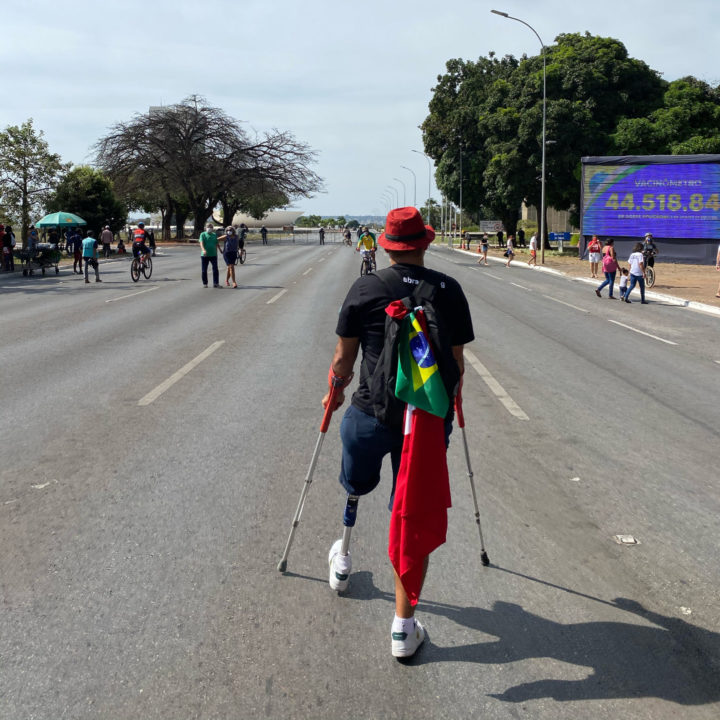 A Foto (registro do que vos escreve, querido Leitor, querida Leitora, Queride que Lê) traz, no primeiro plano, um Manifestante Anônimo em plena deriva transbordante. Com a esquerda perna mecânica e duas muletas, a sua Marcha se fez poesia em Plena Capital da República. Como se perguntasse, em silêncio, a quem está em casa: qual a sua desculpa?