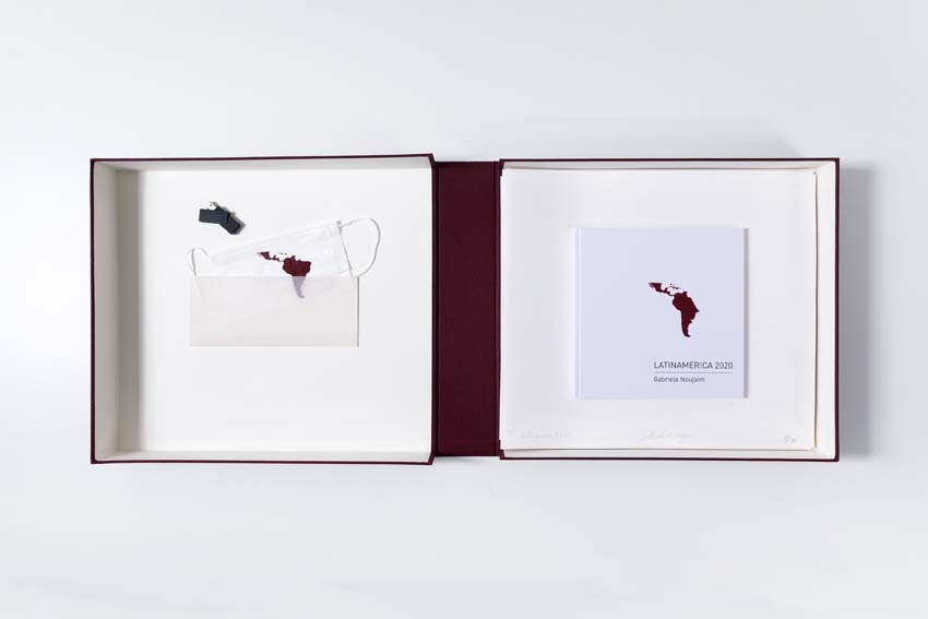 No próximo dia 14 de julho será lançado o livro “Latinameria2020”, da artista Gabriela Noujaim, idealizado e produzido durante a pandemia, no início de seu isolamento voluntário, em abril de 2020. A artista desenvolveu a série “Cov19 Latinamerica”, serigrafias com o mapa da América Latina sobre máscaras cirúrgicas. Os trabalhos foram enviados para profissionais da saúde e para mulheres de diversas regiões e áreas de atuação. A ação com esta obra se completava no ato de vestir a máscara, registrado pelos destinatários, nos apresentando estratégias de coletividades humanas e enfatizando um estado de atenção para as questões sociais e humanitárias. Dessa forma, o trabalho “tangencia o limiar entre vida e obra de arte”. Após as pessoas se auto fotografarem com a máscara, elas enviavam o registro para a artista. Esse material virou um vídeo e teve como desdobramento o livro.
