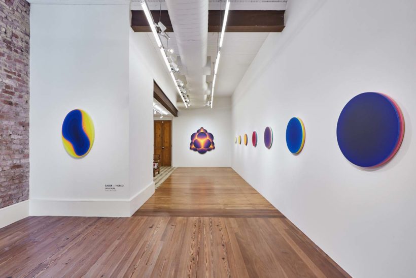 No dia 14 de maio termina a exposição “Calor”, primeira individual do destacado artista tcheco Jan Kaláb, na Galeria Movimento, na Gávea, Rio de Janeiro. A exposição já começa com a pintura na fachada da casa em que está a galeria, seguindo pelas escadas até o espaço interior. Jan Kaláb usou as cores vivas e os tons degradês de seu trabalho, ao fazer esta intervenção. Para o curador Ulisses Carrilho, o trabalho de Kaláb, à luz dos acontecimentos mundiais recentes, sugere algo de “nuclear, bombástico, de energia, de onda de calor, onda térmica”. “E as formas também parecem celulares, microscópicas, como um zoom in”.