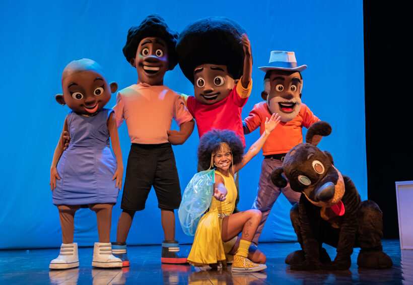 Para impactar ainda mais o olhar do público, foram confeccionados bonecos grandes, com cores fortes, como figurino para as personagens, contribuindo na construção de identidade das crianças. Os bonecos garantem, junto aos outros estímulos, uma explosão dos sentidos visuais e auditivos. Os atores interpretam os personagens dublando as vozes de seus intérpretes originais no desenho animado, como Emicida, David Junior e Yasmin Garcez, entre outros. As linguagens se misturam num espetáculo único e estimulador do imaginário de toda a família, mas, especialmente, do infantil.