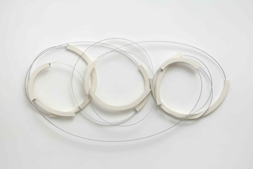 “Entroncados”, série composta por esculturas feitas a partir da junção aleatória de partes de tubos de porcelana, que são previamente produzidos pela artista. Em seguida, são passadas, por dentro deles, uma única fita de aço inox, gerando um inesperado desenho no espaço. “Antes frágil, a porcelana é agora testada pela força da mola da fita de inox, que percorre e tensiona o tubo de cerâmica, a parede, o ar. A passagem de uma única fita de metal que percorre os tubos gera um segundo desenho, não premeditado”, conta a artista, que vê neste título a questão urbana, sugerindo vias que se entroncam.