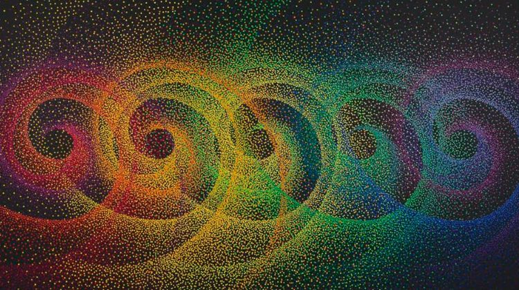 Estará na exposição um conjunto de treze pinturas, com tamanhos que variam de três metros a 1,5 metro, criadas em 2024 da série “Alquimias”, em que Le Parc se debruça sobre o estudo da cor, suas diferentes paletas e os resultados obtidos a partir da interação entre elas. Sua paleta é constituída de catorze tonalidades, que vem utilizando desde 1959, e que vai desde tons mais quentes, como o vermelho e o laranja, até os mais frios, como o azul e o roxo. No entanto, nas “Alquimias”, as cores são reduzidas a pequenos fragmentos, como se fossem partículas, que se agrupam e se organizam de diferentes maneiras. Vistas de longe, o espectador tem a sensação de estar diante de nuvens cromáticas que vibram conforme as tonalidades se friccionam entre si, mas, de perto, ficam visíveis as partículas de cor presentes nas composições.