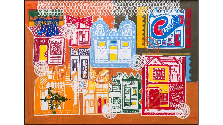 Para o projeto SOLO da ArtRio 2024, Alberto Pitta (1961, Salvador), referência no carnaval da Bahia com suas serigrafias que revolucionaram as fantasias, apresenta desdobramentos de sua série “Moradismo”, conjunto de pinturas em tinta e impressão  sobre tela, que vem desenvolvendo nos últimos dois anos, em que aborda a arquitetura popular brasileira, em especial a do interior do Nordeste, incluindo casas de axé. Na série, Alberto Pitta combina fachadas de casarios, terreiros e igrejas com elementos associados às religiões de matriz africana, como búzios e símbolos de orixás, principalmente os presentes na mitologia iorubá, oriunda do oeste africano e amplamente presente em Salvador e no Recôncavo baiano.