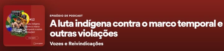 É publicado nesta quarta-feira (23), mais um capítulo do podcast Vozes e Reivindicações. Neste 12º episódio, a comunicadora da Justiça Global, Camila Fiuza, conversa com Osmarina Oliveira, do Cimi; Raphaela Lopes, da Justiça Global, e Ilson Soares, do povo Ava-Guarani. Os temas abordados no programa são: Ação Cível Originária (ACO) 1100,; Marco Temporal; e território Guasu Guavirá.