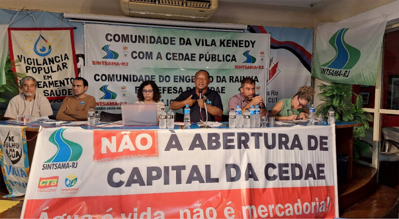 Na terça, 15/4, aconteceu no auditório do Sindicato dos Bancários, no Centro da cidade do Rio de Janeiro, plenária com a participação de vários movimentos sociais, sindicatos e parlamentares para discutir a garantia do direito ao acesso universal à água e organizar calendário de lutas em defesa da Companhia Estadual de Águas e Esgotos do Rio de Janeiro (Cedae) pública. A atividade foi organizada pela Rede de Vigilância Popular em Saneamento e Saúde, pelo Movimento dos Atingidos por Barragens (MAB) e pelo Sindicato dos Trabalhadores nas Empresas de Saneamento e Meio Ambiente do Rio de Janeiro e Região (Sintsama-RJ).