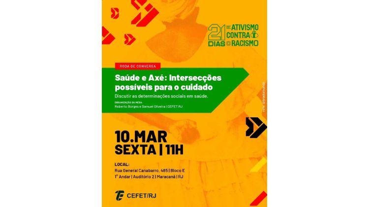 NOTA PRETA Por Mauro Viana   Tema da mesa: Saúde e Axé: Intersecções possíveis para o cuidado: discutir as determinações sociais de saúde. Uma roda de conversa organizada pelos professores Roberto Borges (CEFET-RJ) e Samuel Oliveira (CEFET-RJ) com Carolina Michaella,…