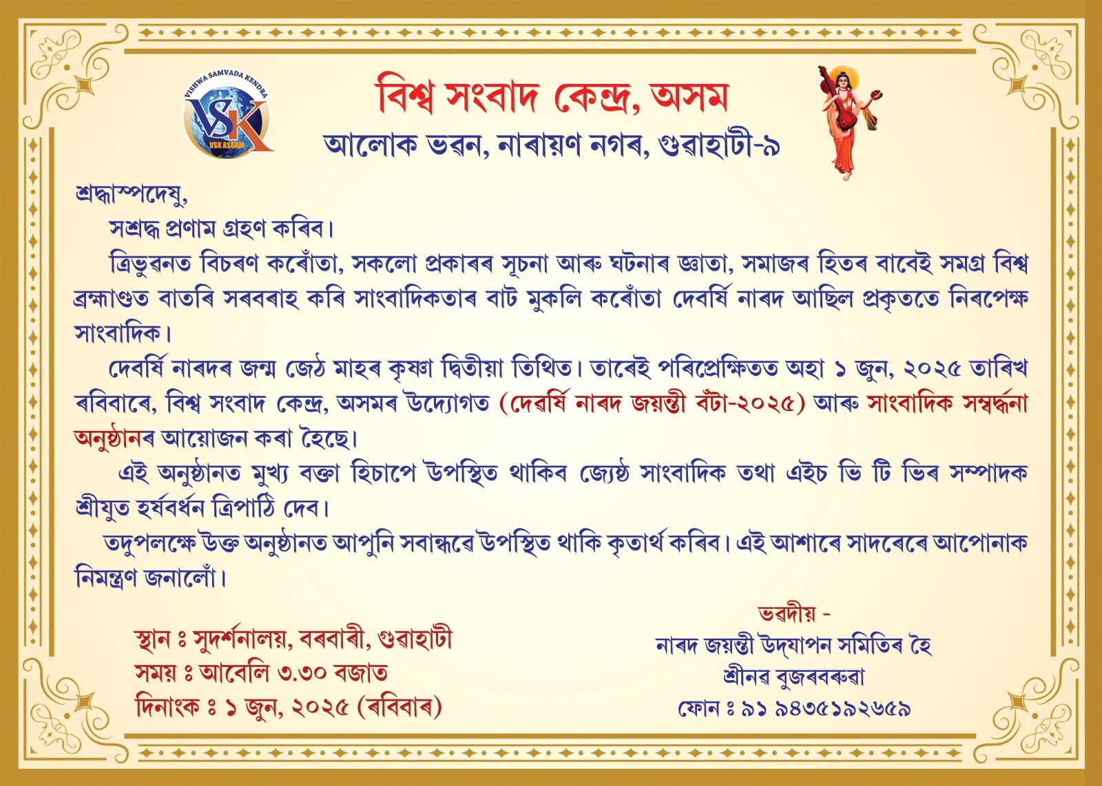 Guwahati: Vishwa Samvad Kendra, Assam organizes the annual Devarshi Narad Jayanti program at Sudarshanalaya in the Barbari area of the city on 1 June (starting 3:30 pm sharp) to commemorate the birth anniversary of the world’s first journalist with…