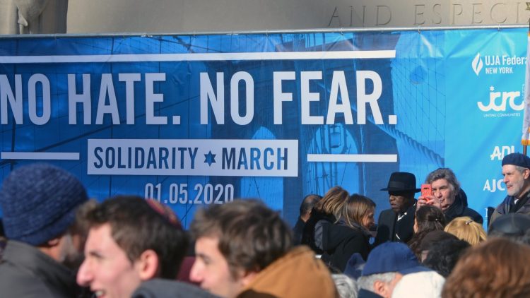 “No Hate, No Fear” march against anti-Semitism in New York City on January 5th 2020. An estimated 25,000 people gathered in Foley Square in lower Manhattan and then walked across the Brooklyn Bridge. People from Montreal and Toronto Canada, Connecticut,…
