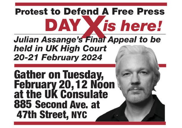 DAY X is here. Gather Tuesday, February 20, 12 Noon @ UK CONSULATE, 885 Second Avenue and 47th Street, NYC Organized by NYC Free Assange, Assange Defense, Stand With Assange NY, Assange Countdown to Freedom, CODEPINK, Socialist Action Today marks…