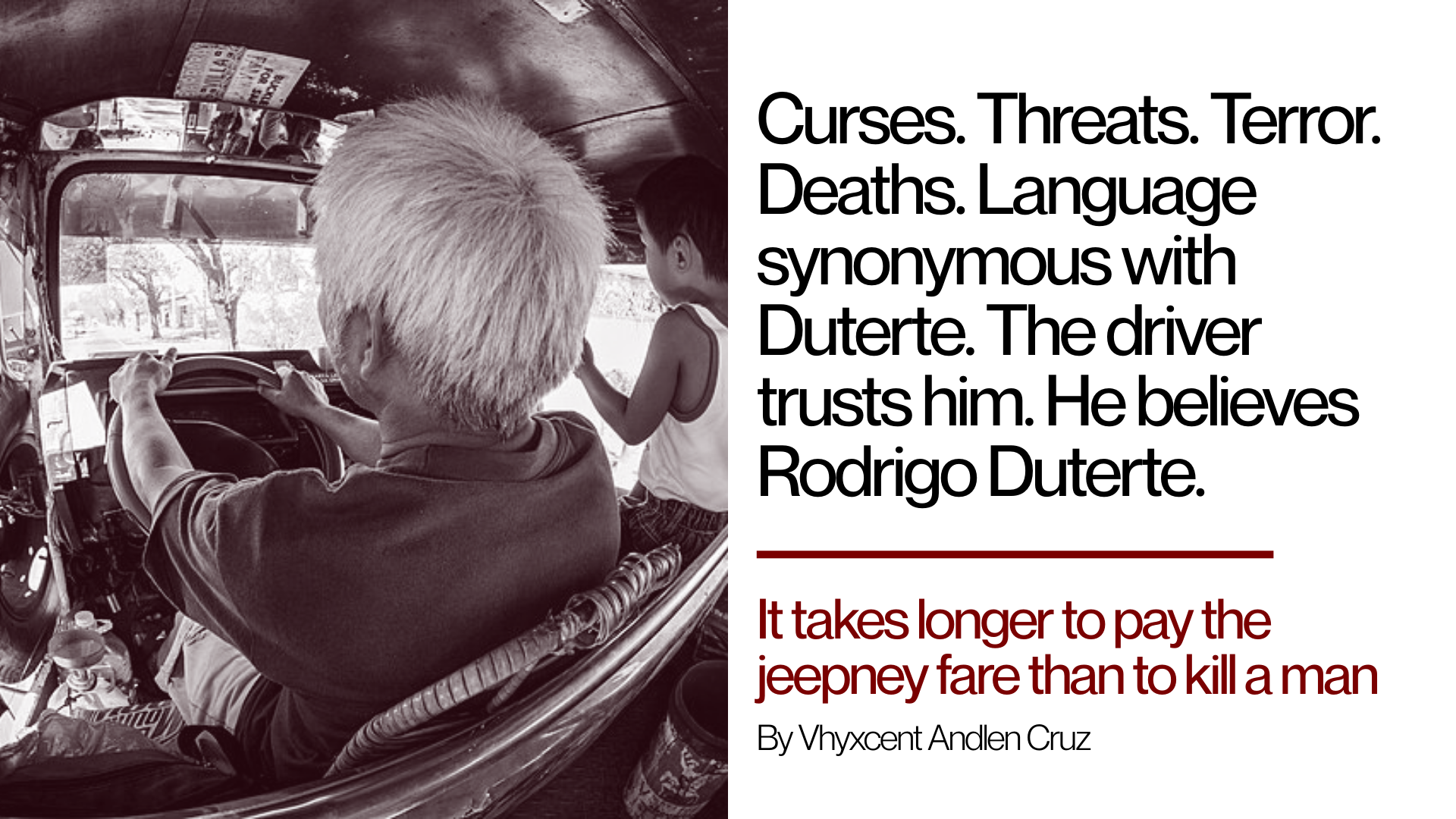 “If you destroy my country. I will kill you,” and people died. I sat beside the jeepney driver. The signage was MRT Highway, Welcome Rotonda, and Quiapo-España. I placed my bag on my lap. Inside was my copy of Patricia…