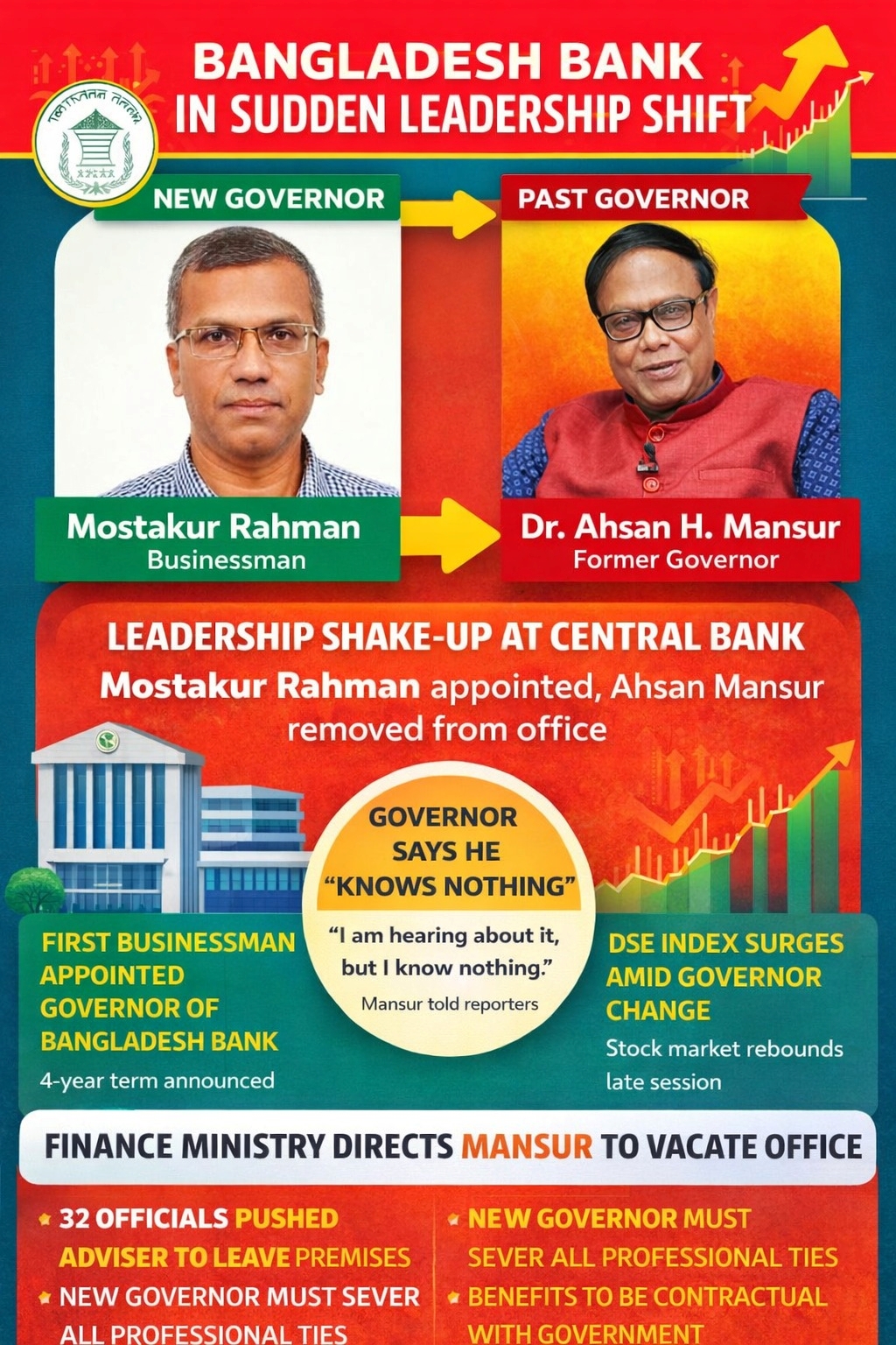 by Asif Showkat Kallol (Dhaka Bureau) Bangladesh’s central bank was thrown into uncertainty on Wednesday as reports emerged that its governor, Ahsan H. Mansur, had been removed from office, while the government moved to appoint Mostakur Rahman as his successor.…
