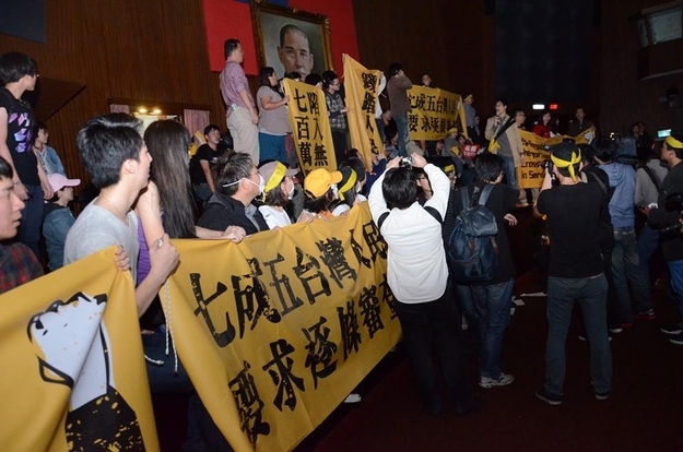 Students and other mostly young protesters made the media as they held banners inside Taiwan’s legislature in Taipei, March 18, 2014. They burst into the Legislative Yuan late Tuesday and fought off police efforts to get them out. Media aired…