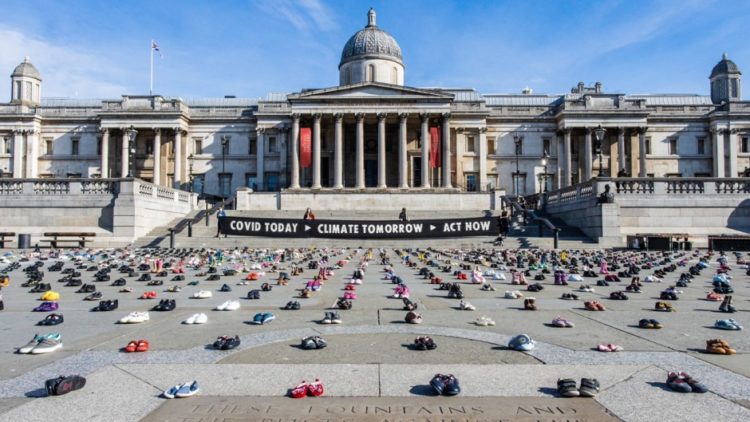 At 8am this morning more than 2000 pairs of children’s shoes were placed in London’s Trafalgar Square with people holding a banner saying ‘Covid today > Climate tomorrow > Act Now’ Extinction Rebellion are calling on the government to act…
